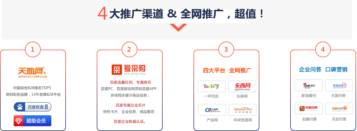 天助網是中國TOP5的知名綜合性B2B平臺,百度權重8,日流量過100萬,擁有超過200萬注冊用戶, 付費用戶超過10萬。天助網是深圳知名品牌,全國擁有300多家本地服務商,在業內擁有優良的口碑。